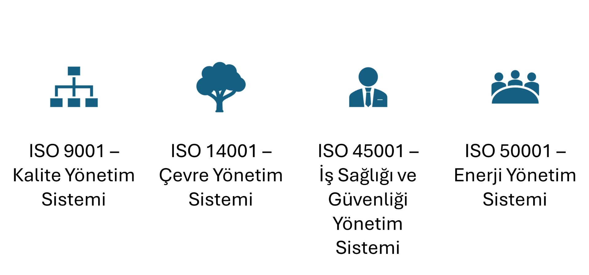 ISO 9001, 14001, 45001 ve 50001 danışmanlığı ile süreçlerinizin uluslararası standartlara uyumunu sağlıyor, operasyonel verimliliğinizi artırıyor ve sürdürülebilir yönetim altyapısı oluşturuyoruz.